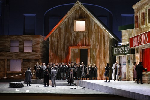Peter Grimes, tratto da una novella inglese del tardo Settecento, con un libretto di Montagu Slater, è “British” dall’inizio alla fine, nonostante rappresenti una rivoluzione che nel 1945 ha inciso profondamente sul teatro in musica della seconda metà del Novecento. La vicenda è nota. Nel 1830 o giù di lì, in un piccolo gretto e pettegolo, borgo marinaro, il pescatore Peter Grimes è un “diverso” (Britten, ricordiamolo, era omosessuale, religioso osservante e obiettore di coscienza durante la seconda guerra mondiale). Il suo mozzo muore in mare. Viene assolto dall’accusa di averlo ucciso, ma nel villaggio lo si considera pervertito e sadico. Soltanto la maestra (una vedova) gli dà fiducia e il pescatore spera di avere un futuro con lei. Avviene, però, un secondo incidente: un altro mozzo muore in circostanze difficili da spiegare. A Peter non resta che mettersi sulla propria barca e partire per sempre. Suicidandosi in mare. Mentre nel borgo torna la calma perbenista. Questa scarna vicenda di solitudine e incomprensione è arricchita non solo da un testo stringato ed efficace ma da una partitura ricchissima: sei “interludi marini” separano le varie scene e la vocalità alterna declamato con ariosi di grande lirismo, nonché concertati di spessore (sia a quattro voci femminili sia di tutta la compagnia). Benjamin Britten dedicò gran parte della propria vita e del proprio lavoro ad individuare nuove forme di teatro in musica per il Novecento, ed i secoli successivi, nella convinzione che la forme ottocentesche e della prima metà del ventesimo secolo, non fossero più ‘sostenibili’ in epoca di accresciuta concorrenza di altre forme di spettacolo (cinema, televisione) e di aumento dei costi reali per maestranze tecniche e artistiche.