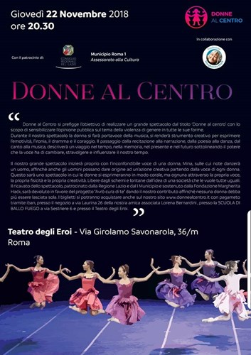 Per aiutare queste donne è stato organizzato uno spettacolo dall’associazione “Donne al Centro“ che si terrà il prossimo 22 novembre a Roma al Teatro degli Eroi (ore 20,30), e a pochi giorni dalla Giornata internazionale contro la violenza sulle donne in programma il 25 novembre. Iniziativa in collaborazione con la “Fondazione Margherita Hack” e col patrocinio della Regione Lazio e del Primo Municipio di Roma. I biglietti, totalmente a scopo benefico, sono in vendita presso lo stesso Teatro degli Eroi (via Girolamo Savonarola n. 36, quartiere Prati), o anche presso la “Otw boutique” in via Laurina 26 o presso la scuola di ballo Fuego (via Sestriere, 6).
