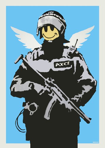Etica vandalica, spirito critico, ribellione antagonista, postura controculturale rappresentano le tre dimensioni della modernità con cui l’autore propone al posto di armi, guerre e violenza la sua leggerezza estetica, l’ironia provocatoria e il segno libero. La critica non è destrutturante, come oggi rischiano i giovani, se dove c’è dissenso fiorisce l’arte. Dillo con un graffito, un disegno, un’opera! Ecco la serie del “poliziotto volante”, gigantesche figure realizzate a stencil su cartone in occasione della prima grande mostra nel 2003 in un magazzino della East End di Londra. E alcune sagome di “Flying Copper” sono state poi collocate a Londra e Vienna. L’agente di polizia è in assetto antisommossa, ma con il volto sostituito da un iconico smile. Oppure lo smile al posto del fucile, per avvisare in doppio senso, nel bene e nel male, su come si possa trasformare chi ci dovrebbe difendere.