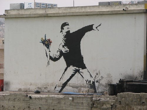 L’esposizione umbra ha infatti come copertina “la colomba di Banksy” di memoria picassiana col ramoscello d’ulivo a cui il visionario di Bristol ha però indossato un giubbotto antiproiettile. Banksy l’ha dipinta proprio in Palestina nel 2007. E l’altra opera celebre, “il lanciatore di fiori”, è un giovane coinvolto in uno scontro col volto nascosto che tira invece di una molotov un mazzo di fiori. Fa pensare agli attivisti di Stati Uniti e Gran Bretagna contro la guerra nel Vietnam, a cui il misterioso pacifista di “Loves in the Air” toglieva le armi e faceva lanciare la bellezza. I due graffiti sono stati incisi, sempre di nascosto, sul muro più divisorio, il Muro di Betlemme, figure di 5 metri di altezza, che cercano di sfondare le divisioni odierne. La violenza distrugge l’estetica.