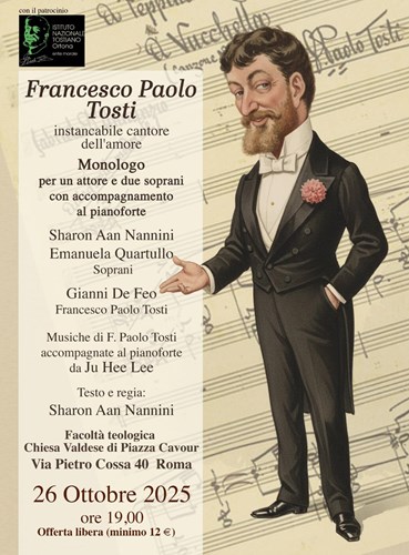 “Francesco Paolo Tosti è entrato nella mia vita molti anni fa, quando frequentavo il Conservatorio di Santa Cecilia per studiare canto lirico. Mi fu offerto un piccolo ruolo, avrei interpretato la contessina D’Alba, un’appassionata delle romanze di Tosti. Il film era D’Annunzio, regia Sergio Nasca, del 1987 (dedicato alla figura emergente del poeta pescarese, nei suoi anni giovanili, 1887-1892, sulla scena culturale romana: uomo presuntuoso e caparbio, ma anche originale ed eclettico, ndr). Nella scena che mi vedeva protagonista interpretavo una famosa romanza di Tosti: Sogno”. Sharon Aan Nannini, attrice, regista e cantante, parla con passione del suo format Francesco Paolo Tosti, instancabile cantore dell’amore, un reading con interventi musicali dal vivo, che sarà in scena domenica 26 ottobre, a Roma alle 19, nell’Aula Magna della Facoltà valdese di teologia, in Via Pietro Cossa. Ma chi è stato esattamente Tosti nella musica italiana, e come è nato l’interesse di Sharon Nannini per le sue Opere e i giorni? Tosti (1846-1916), abruzzese di Ortona, cantante, compositore e docente di canto (al Department of Music, King’s College London e in almeno un altro importate istituto), è noto soprattutto come autore di celebri romanze da salotto o da camera.