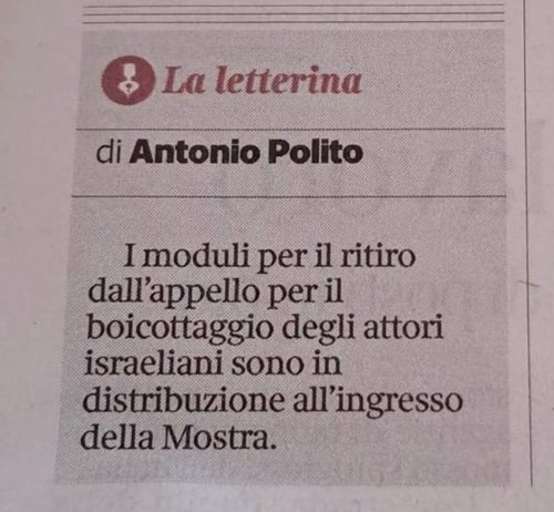 Come volevasi dimostrare. Dopo le ovvie polemiche conto l’appello anti israeliano per boicottare gli attori dello Stato ebraico e i simpatizzanti di Israele, promanato da persone che hanno all’uopo strumentalizzato la Mostra del Cinema di Venezia, sono cominciate le precipitose marce indietro. Con interviste ad hoc concordate per salvare il salvabile. Prima Roberto Andò, poi Toni Servillo, infine – prima pagina di venerdi scorso sul Corrierone – Carlo Verdone. Tutti nomi che in effetti in mezzo a quei vip di sinistra e figli di papà cinematografaro ci stavano come i cavoli a merenda. D’altronde, quel che diceva Indro Montanelli decine di anni or sono è sempre valido: chi si firma è perduto. Sembrava in effetti di rivedere un remake della vergognosa petizione contro il commissario Luigi Calabresi, che pochi mesi dopo venne ucciso dai terroristi del partito armato comunista. Anche allora fu una corsa al ripensamento attivo.