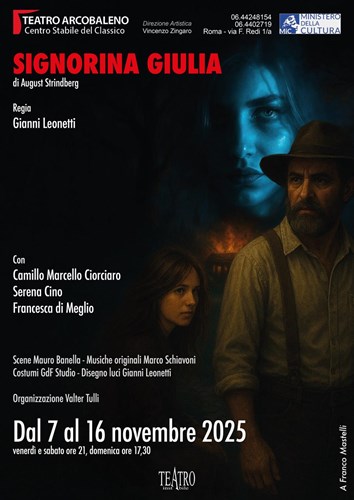 La regia di Gianni Leonetti porta al Teatro Arcobaleno un classico intramontabile del teatro naturalista. Scritto nel 1888, Signorina Giulia di August Strindberg è considerato il manifesto del teatro naturalistico. L'autore svedese mette in scena, in un'unica notte, il dramma di una passione proibita che travolge i confini sociali e morali del suo tempo. Nella cucina di una tenuta di campagna – simbolo di quotidianità e rassicurante familiarità – esplode, nella magica notte di San Giovanni , l'attrazione fatale tra la nobile Giulia e il suo servo Giovanni . Un incontro che si trasforma presto in un duello psicologico e carnale, fino al tragico epilogo. La regia di Gianni Leonetti sceglie di esplorare l'animo dei personaggi con uno sguardo contemporaneo, scavando nelle pieghe più oscure dell'inconscio. Lo spettacolo si apre con un suggestivo video onirico – il sogno di Giulia – popolato di simboli che rimandano al mondo interiore della protagonista, “il regno delle verità nascoste e indicibili”.