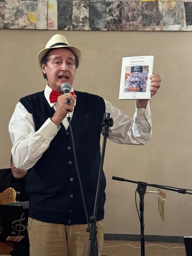 Invece appare un signore con cappello di paglia e papillon rosso, con in mano il suo libro best-seller, “NapoLotto”. Un vero spasso, capace di far vivere le storie partenopee come se ci si trovasse in un vicolo del rione Sanità intorno a un personaggio del mondo di Bellavista.