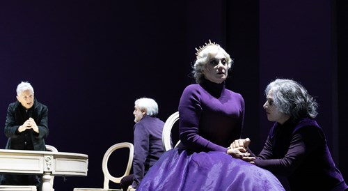 Se il potere è demoniaco, cosa c’è meglio di un presunto demone come il Re Riccardo III d’Inghilterra per gestirlo? Leggendo il dramma shakespeariano si ha l’impressione che l’ultimo re della casata degli York non fosse granché simpatico al suo grande autore, cosicché Maria Paiato, rivestendone il ruolo nello spettacolo omonimo, Riccardo III, ha il compito di portalo in scena al Teatro Argentina (dove resterà in cartellone fino al 15 marzo) scarrocciandolo dalla farsa alla tragedia, con una punta sottile di umanità. Anche perché leggendo le riforme fatte da Riccardo nei suoi due anni di regno (dato che venne incoronato nel luglio 1483 e morì in battaglia nell’agosto 1485), non parrebbe così pazzo e sanguinario come lo si vorrebbe far credere. In questa rappresentazione della malattia (grave) del potere si respira un po’ del paradosso del Comma 22, per cui: “Chi è pazzo può chiedere di essere esentato dalle missioni di volo, ma chi chiede di essere esentato dalle missioni di volo non è pazzo”. Così funziona un re pazzo che dichiarandosi pazzo chiede (fintamente) di essere esentato dal fare il re. All’apertura di sipario, Maria-Riccardo si fa trovare distesa su di un grande tavolo, sul quale è sospesa una bara chiara per l’intera durata dello spettacolo, in attesa che uno a uno i commensali che prendono parte a un grande Consiglio immaginario del regno, cadano per mano dei sicari del Conte di Gloucester futuro re, portandosi via la sedia sulla quale erano prima seduti, chiaro segno della loro definitiva scomparsa alla pericolosa tavola del potere.
