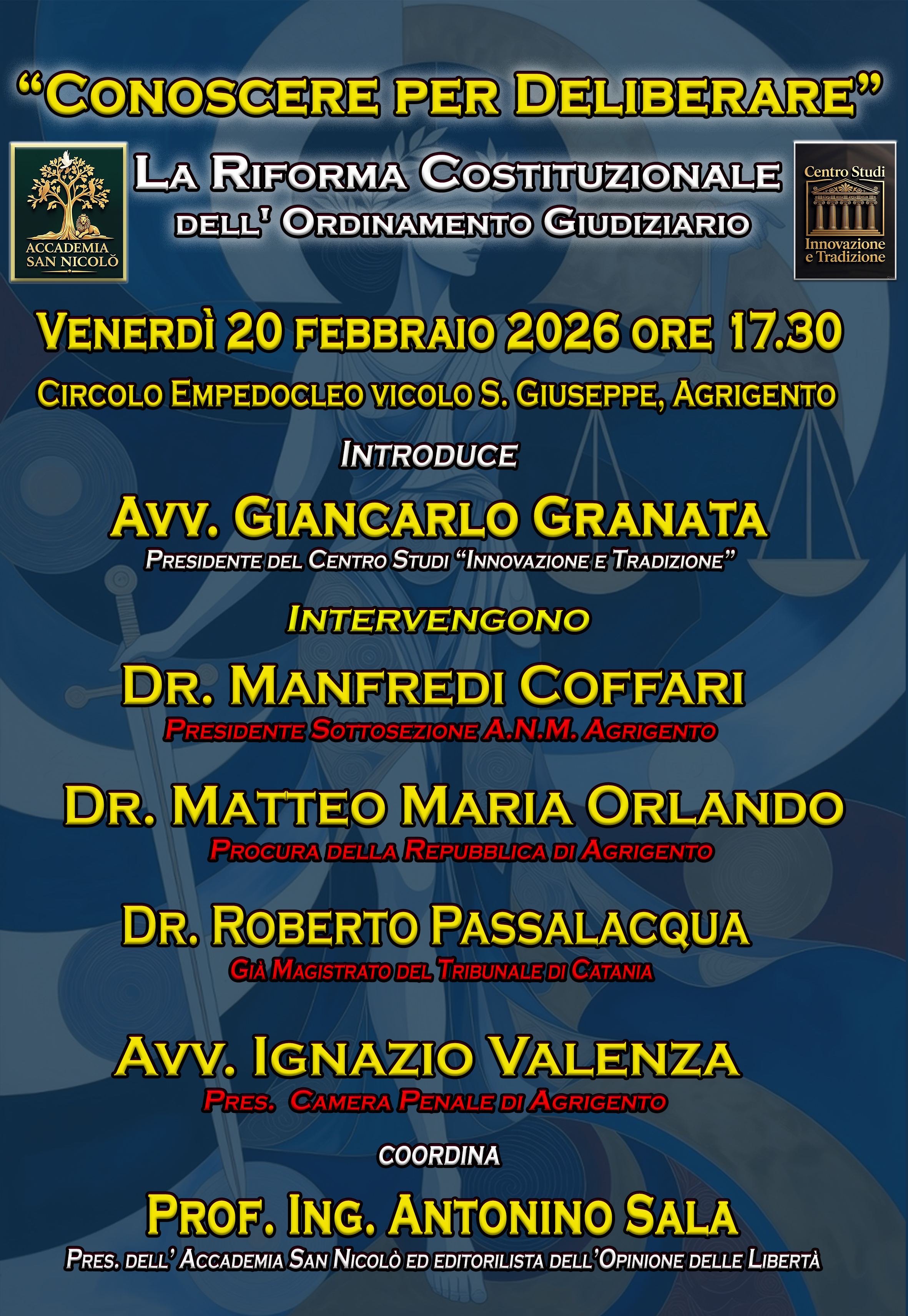 Il referendum si avvicina. Quando manca poco più di un mese alla tornata elettorale che metterà in mano agli italiani la scelta sulla riforma della giustizia promossa dal ministro della Giustizia Carlo Nordio, un interessante dibattito si tiene oggi pomeriggio presso il Circolo Empedocleo di Agrigento. L’incontro, dal titolo “Conoscere per Deliberare”, è dedicato alla riforma costituzionale dell’ordinamento giudiziario voluta dal guardasigilli, e organizzato dal Centro studi innovazione e tradizione e dall’Accademia San Nicolò. Dopo l’introduzione dell’avvocato Giancarlo Granata e con il coordinamento del professor ingegnere Antonino Sala – scrittore e collaboratore de L’Opinione delle Libertà – il confronto entrerà nel vivo grazie agli interventi di relatori che rappresentano sensibilità ed esperienze diverse: il dottor Manfredi Coffari, presidente della sottosezione di Agrigento dell’Associazione nazionale magistrati, il dottor Matteo Maria Orlando della Procura della Repubblica di Agrigento, il dottor Roberto Passalacqua, già magistrato del Tribunale di Catania, e l’avvocato Ignazio Valenza, presidente della Camera penale di Agrigento.