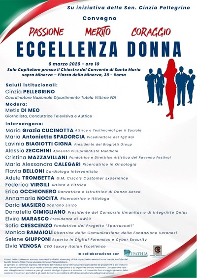 Il 6 marzo, alle ore 10 presso la sala Capitolare del Senato, si celebrerà la sesta edizione del Premio “Eccellenza Donna”: un riconoscimento dedicato a tutte le donne che, con il loro impegno, talento e determinazione, contribuiscono in modo significativo alla crescita della società e della cultura italiana.