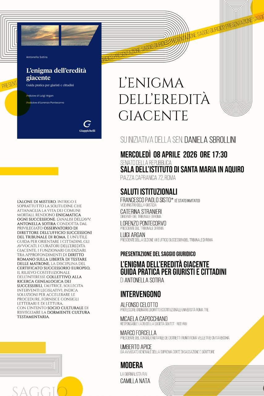 Interverranno durante l’evento Francesco Paolo Sisto, viceministro della Giustizia; Caterina Stranieri, Dirigente amministrativo del Tribunale di Roma; Lorenzo Pontecorvo, presidente del Tribunale di Roma; Luigi Argan, presidente della sezione VII e Ufficio Successioni del Tribunale di Roma; Alfonso Celotto, professore ordinario di Diritto Costituzionale all’Università Roma Tre; Micaela Capocchiano, responsabile Lazio della società Coutot-Roehrig Italia; Marco Forcella, Presidente del Consiglio Notarile dei Distretti Riuniti di Roma, Velletri e Civitavecchia; Umberto Apice, già avvocato della Corte Suprema di Cassazione e scrittore. Modera la giornalista Rai Camilla Nata.