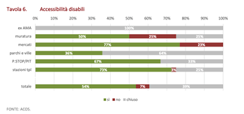 Il 34 per cento delle toilette controllate è a ingresso gratuito. In quelle rimanenti a pagamento “la possibilità di accedere con moneta elettronica (carta di credito, bancomat, app) si è rilevata solo nei P.Stop e nel Pit di Fori Imperiali”. In linea di massima, è riscontrata la carenza di macchine cambiamonete in prossimità degli ingressi dei bagni a pagamento privi di presidio, “primi tra tutti quelli nelle stazioni Tpl”. Quanto alla presenza di personale di custodia dei bagni, è assente in tutti quelli delle stazioni Tpl, “nel 79 per cento dei mercati e in due P.Stop; la videosorveglianza, invece, “è stata agevolmente individuata dagli ispettori dell’Agenzia nel 27 per cento delle rilevazioni, prevalentemente nei P.Stop”. La segnaletica per bagni riservati a disabili “è stata constatata nel 75 per cento delle ispezioni, assente in qualche caso per i bagni in muratura e nei parchi, nella maggioranza dei casi per quelli dei mercati”. I percorsi per gli ipovedenti “sono stati trovati solo nei bagni delle stazioni della metropolitana”.