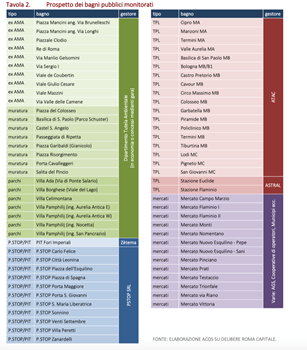 Per i P.Stop, “sono stati trovati sempre chiusi quelli a piazza Sonnino, a via Venti Settembre, a piazza di Porta Maggiore e a largo di Villa Peretti, una sola volta quello a via Carlo Felice: in alcuni casi le chiusure erano annunciate sul sito e sui social del gestore per lavori, ma di ciò non vi erano avvisi all’esterno dei bagni”. Curiosità: nelle stazioni del trasporto pubblico locale “non è mai stato possibile monitorare i bagni nella stazione Flaminio della Roma-Viterbo e nelle stazioni della metropolitana Manzoni (linea A) e Pigneto (linea C); si sono potuti ispezionare solo una volta quelli nelle fermate della metro Cipro (linea A), Colosseo (linea B), Termini (linea B) e Lodi (linea C).