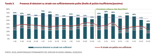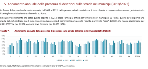 Non rimuovere gli escrementi animali dal suolo comporta teoricamente una sanzione che va da 50 a 500 euro, eppure l’abbandono delle deiezioni è una “prassi” ricorrente nel 2022, riscontrata nel 38 per cento delle oltre 9mila strade osservate, a fronte di un 24 per cento di casi in cui vengono complessivamente notati rifiuti abbandonati di vario genere (sacchetti, ingombranti, pericolosi). Da un punto di vista metodologico, il monitoraggio ha in serbo un minimo di 2.070 ispezioni a trimestre (“ma in media se ne portano a buon fine oltre 2.250, superando le 9mila ispezioni all’anno”); i controlli sono stratificati per Municipio, per giorno della settimana (da lunedì a sabato) e per fasce orarie (mattina, pomeriggio, sera). Vengono così estratte due strade per Municipio – complessivamente 30 strade ispezionate al giorno – su una lunghezza di circa 200 metri per ispezione. Ogni verifica segnala, tra le altre cose, il livello di pulizia (con tanto di documentazione fotografica), le possibili violazioni al Regolamento dei rifiuti, la presenza di rifiuti abbandonati.