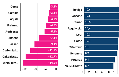 Dando un’occhiata alle province, Rieti e Potenza registrano aumenti, rispettivamente, del 62,3 per cento e 54,7 per cento. A seguire Cremona (31,9 per cento), La Spezia (31,5 per cento) e le altre al di sotto del 30 per cento. Tolte le prime due posizioni, si trovano nel Nord Italia le province dove il costo medio per un incontro è aumentato di più. Dall’altra parte, le 10 province dove il costo della vita aumenta di più sono in tre regioni: Liguria, Emilia-Romagna e Sicilia. Nessuna di queste province, così, corrisponde alle precedenti degli aumenti escort. A onor del vero, in 18 province i prezzi hanno una leggera flessione, che passa dall’1 per cento di Parma al 14 per cento di Olbia-Tempio. Notando le 10 province in cui il costo dei servizi escort diminuisce in maniera sostanziale, si trovano tutte (esclusa Como, -3,2 per cento), nelle Isole, al Sud e al Centro. Tre i capoluoghi di regione: L’Aquila (-4 per cento), Palermo (-4,7 per cento), Ancona (-7,6 per cento).