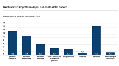 Nel 2021, secondo i dati emersi da Escort Advisor, il costo medio delle sex worker in Italia è di 81 euro. Però, con il caro-prezzi dell’ultimo anno, il listino è salito del 7,4 per cento, toccando quota 87 euro. Una crescita del costo generale che, nel caso specifico, si ripercuote nei servizi e prodotti usufruiti dalle escort, sia nella vita quotidiana che nel corso dello svolgimento della professione. In concreto, per il lavoro di sex working è necessaria una casa, che nel 2022 porta con sé maggiori aumenti: l’affitto è l’aspetto cresciuto meno (+1,5 per cento), mentre la fornitura elettrica sale del 135 per cento. Potrebbero rientrare nell’alveo pure i costi legati alla casa (arredamento e manutenzione, per dire), eppure molto spesso le escort svolgono l’attività in appartamenti in affitto, muovendosi in tour. E nei servizi di trasporto c’è un aumento del 16,7 per cento. Per quanto concerne gli aspetti quotidiani, salgono del 13,8 per cento gli alimenti, dell’11,1 per cento le bevande analcoliche e del 6,3 quelle alcoliche. Sul fronte delle spese personali, compaiono beni e servizi per la cura della persona, lievitati del 3,9 per cento, L’abbigliamento cresce del 3,4 per cento, le calzature dell’1,2 per cento.